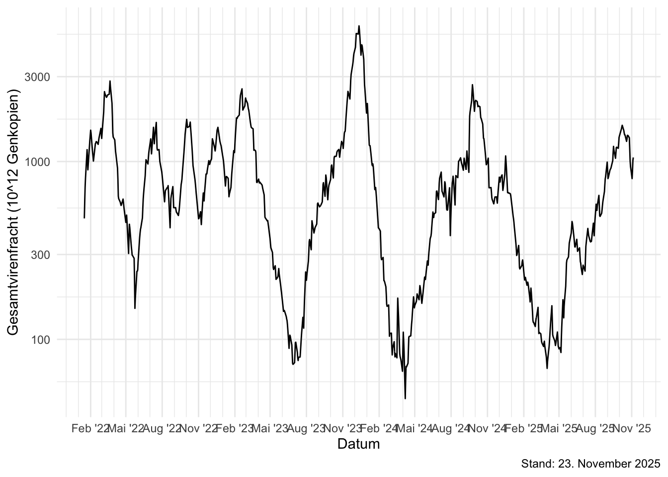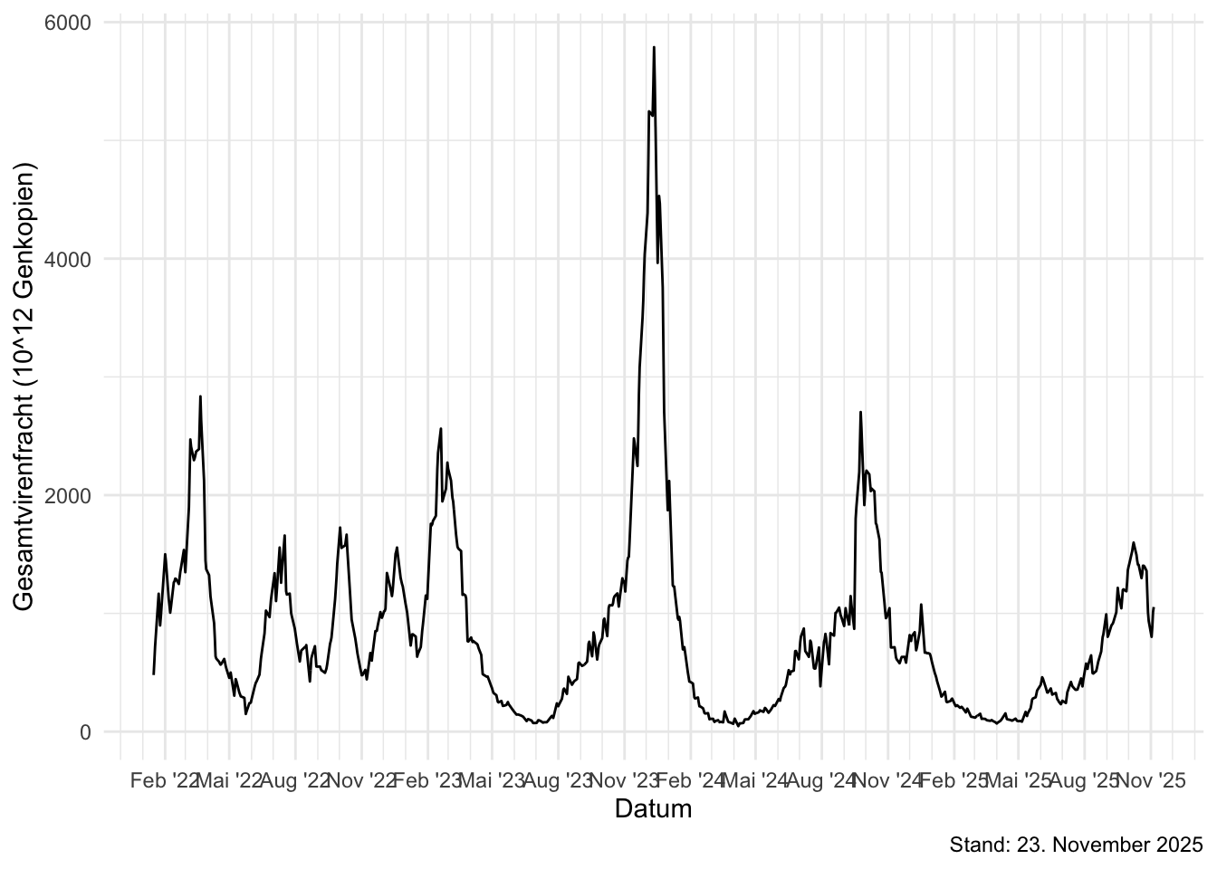 Daten zur Gesamtvirenfracht, die auf Werten aus allen Bundesländer beruhen, gibt es bis zum 5. November 2025.
